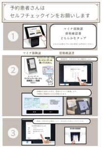 受付をスムーズに行うために、自動受付機を設置しました。 ネット予約の患者さんはセルフチェックインが便利です。 ご予約のない方、保険情報や医療証に変更のある方は受付にお声がけください。 Screenshot
